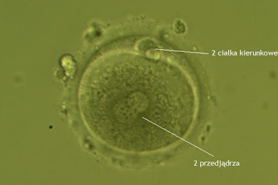 W prawidłowo zapłodnionym oocycie powinny być widoczne dwa przedjądrza (żeńskie oraz męskie) oraz dwa ciałka kierunkowe: